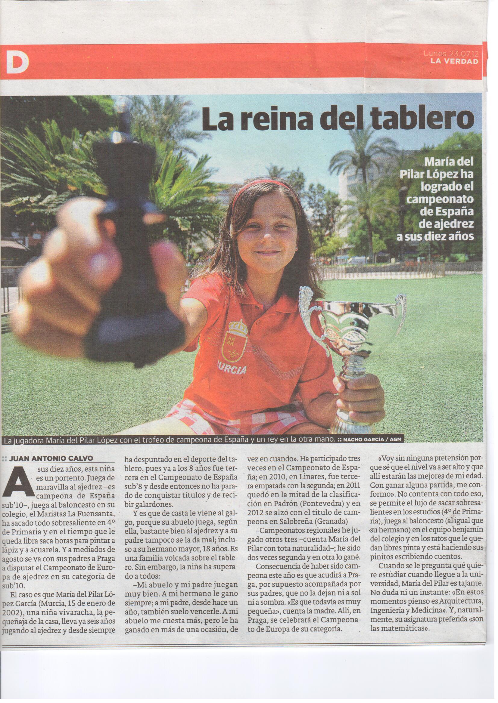El diario La Verdad de Murcia, en su sección de deportes, se hace eco en el día de hoy del Campeonato de España sub 10 logrado por nuestra jugadora María del Pilar López García, con un amplio reportaje, una foto de gran tamaño y una entrevista a la jugadora, amena divertida y muy simpatica.
